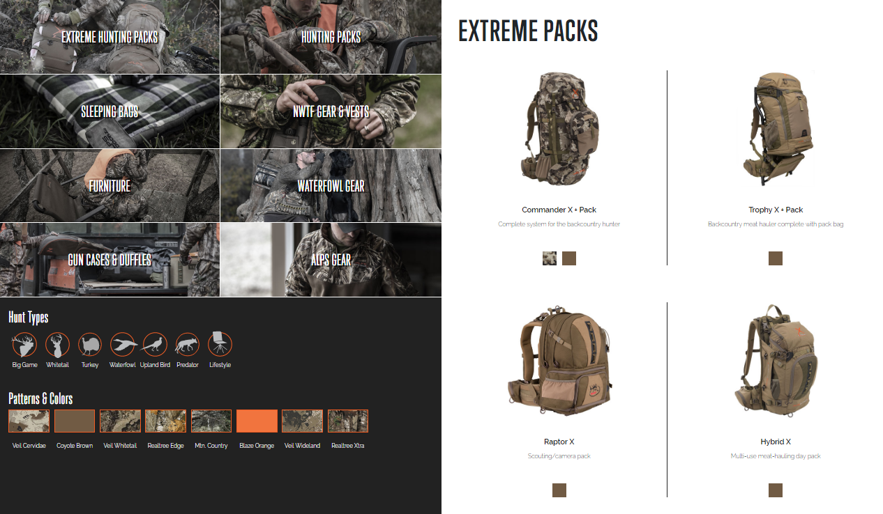 We knew there was plenty of room for more product information, increased user engagement, and secondary information sources that the user might find useful. Without overcomplicating the new page design, we redesigned the layout and added a few interactive filtering options (including hunt type and pattern/color) to ensure the user could find what she was looking for before clicking into specific products. (see photo below and click to expand).