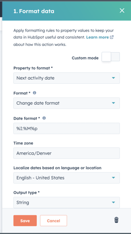 Create a workflow to reformat the 'Next Activity Date' field. When used as a personalization token, this property only displays the date. However, the time data is stored in the field value. We need to separate it out into the 'Meeting Time' property you created in Step 1.