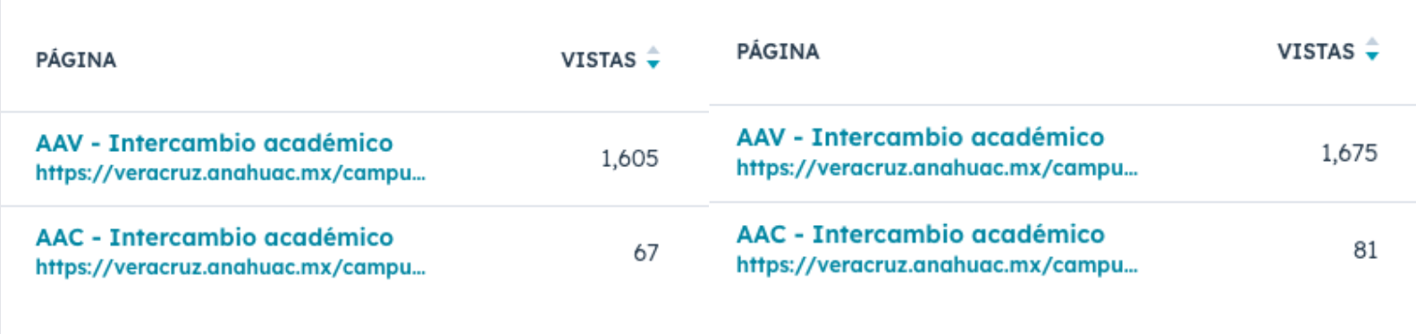 Para la página “Intercambio académico” podemos notar un aumento en cuanto a las vistas de ambas páginas de campus.
