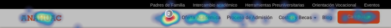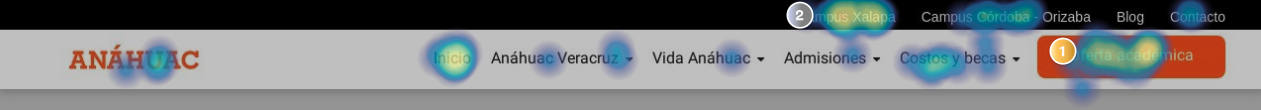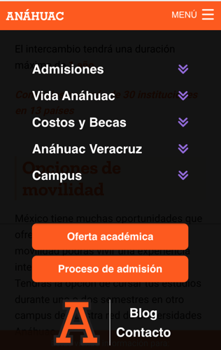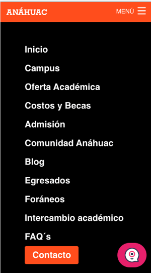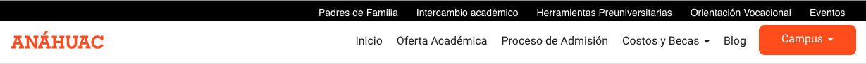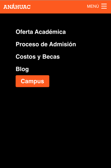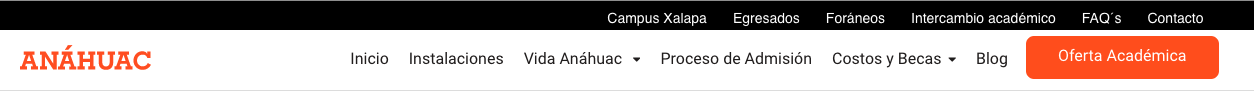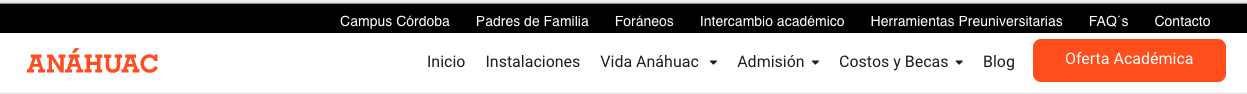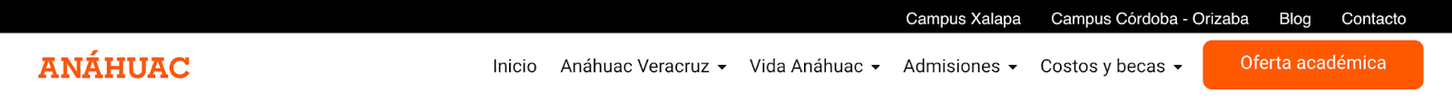 Al concluir la implementación de la plantilla, el resultado de la navegación es actualmente visible en su sitio comercial https://veracruz.anahuac.mx/licenciaturas y se estableció de la siguiente manera para desktop: