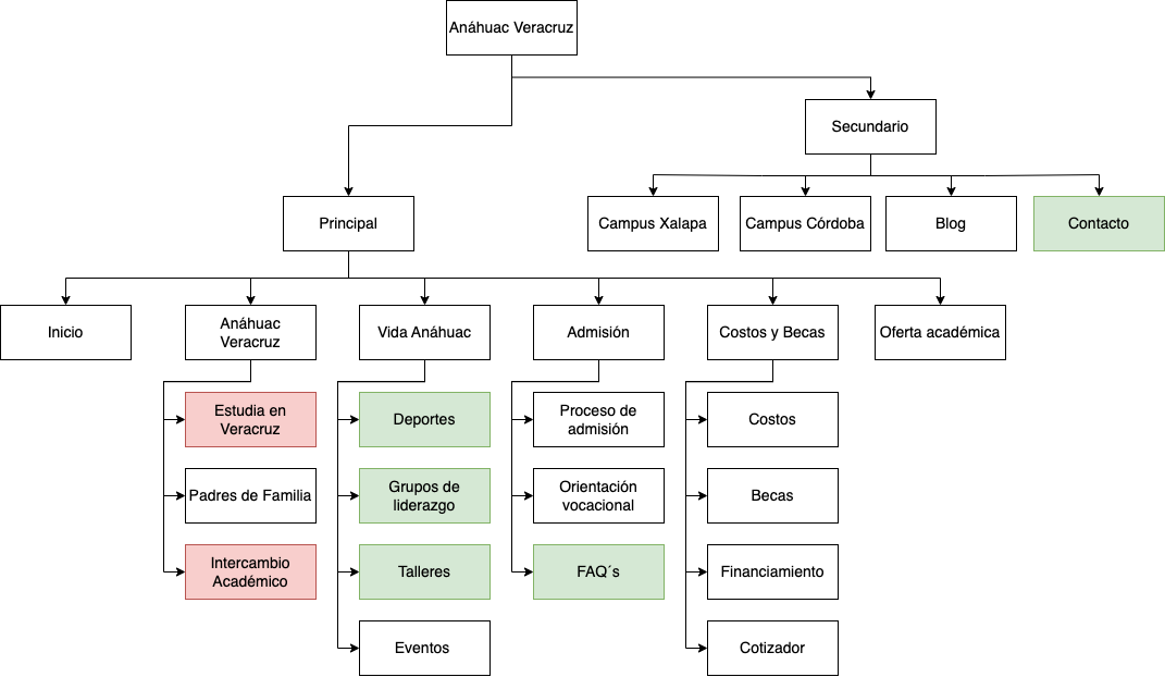 Mediante un análisis en las urls y páginas del sitio, pudimos identificar los contenidos “repetidos” por campus, al igual que el total de páginas que necesitábamos recategorizar para diseñar la nueva navegación.