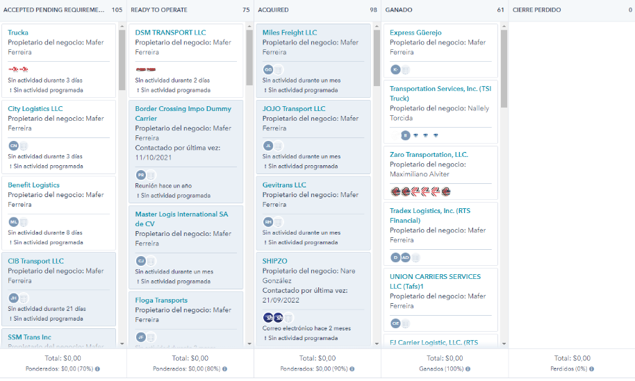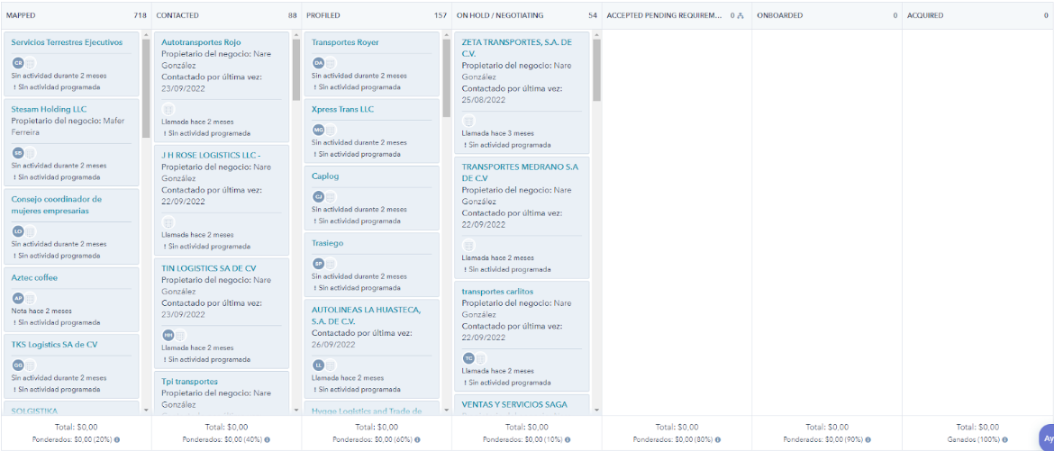 Nos enfocamos en distintos puntos para poder lograr las automatizaciones de manera correcta e igualmente agilizar procesos dentro del Pipeline, ya que anteriormente este se creaban muchos negocios que no empataban con las necesidades por el tipo de unidad o cantidad de unidades que tienen para ofrecer a Nuvocargo Carriers, estas son las etapas sobre las que trabajamos: