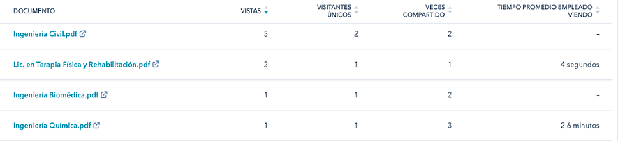 De solo compartir 4 documentos, se cargaron más de 60 nuevos archivos dentro de HubSpot sobre distintos temas como costos, infografías, información de becas, cartas compromiso, cotizador, guía de estudios, etc. Ahora el equipo de ventas ha compartido más de 2000 veces sus documentos cargados.