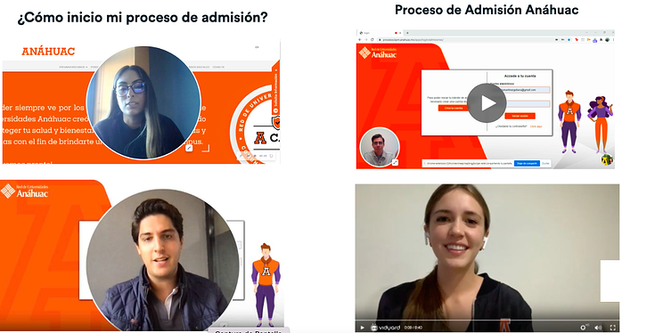 Dentro de algunas plantillas, sobre todo las de primer contacto, se comparte un video de presentación del asesor o el proceso de admisión. El video fue grabado con la herramienta Vidyard que ya cuenta con una integración nativa con HubSpot. Se dio el taller del uso de esta herramienta, posteriormente crearon su video y se les proporcionó retroalimentación, para que finalmente se insertaran en sus plantillas de primer contacto. Con esta estrategia se busca interactuar de manera más personalizada con el aspirante, que conozca a través de la pantalla al asesor que lo apoyará en todo su proceso.