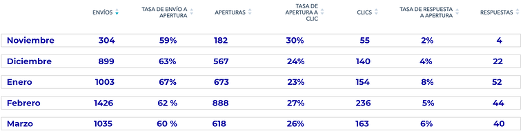 Se observa un incremento del 708% en inscripciones a secuencias por parte de los Asesores. Un incremento del 447% en aperturas y un aumento del 400% en respuestas por inscripción.