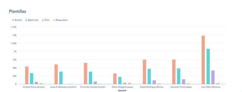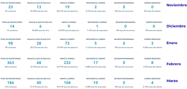 De comenzar con 0 plantillas de correos, se cuentan actualmente con 113 en total. Se ha visto un incremento del 1200% (4 de 52) en respuesta de contactos a las plantillas creadas por el equipo.
