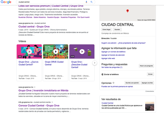 Con la estrategia de topic clusters de Ciudad Central rápidamente nos posicionamos en el primer lugar en búsqueda orgánica con una de las keywords genéricas “lotes urbanizados” y la keyword principal: “Ciudad Central”, aparece en toda la primera página de Google.