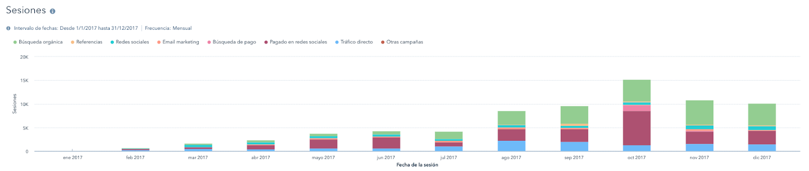 En esta primera gráfica se puede apreciar el comportamiento del sitio dentro del año 1, en donde el pico se pudo alcanzar en octubre con 15,000 sesiones registradas.