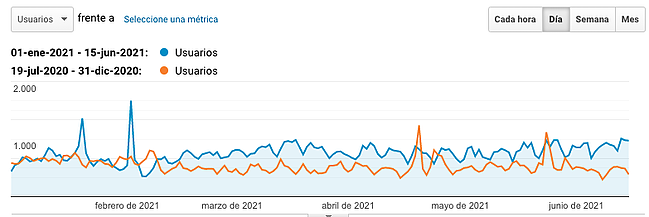 Comparando los primeros 6 meses de lanzamiento (gráfica azul) contra el periodo anterior, podemos observar que hay un aumento de tráfico, Google Analytics nos muestra que aumentamos un 38.96% en usuarios y 42.37% nuevos usuarios.