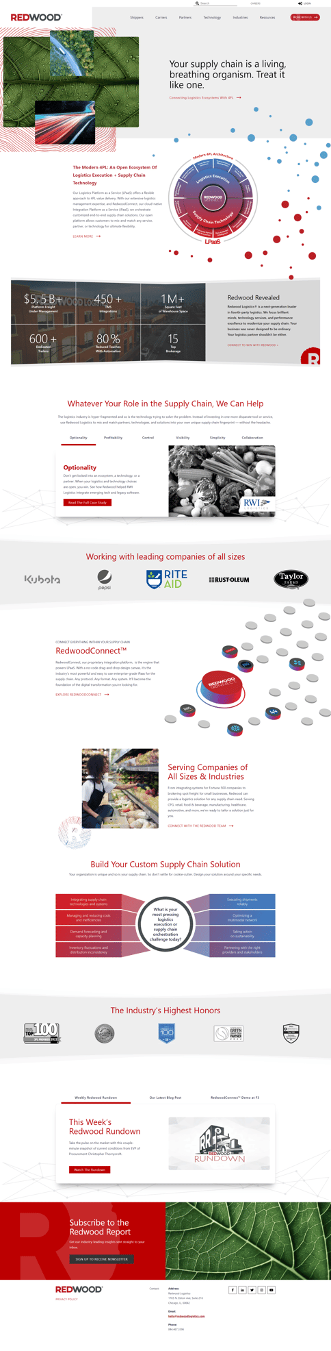 We started by carefully considering Redwood's various audience demographics and the entirety of the customer's journey toward improving their logistics processes, which includes shippers, carriers and partners. While some persona's were traditional clients like shippers, we had other dynamics with internal talent acquisition of carriers, and a hybrid in partners that were a source of revenue, but not in the traditional client sense. Understanding what each persona struggled with, found value in, and took into consideration while making decisions, we were able to craft a unique user experience and meaningful messaging that resonated with each segment.