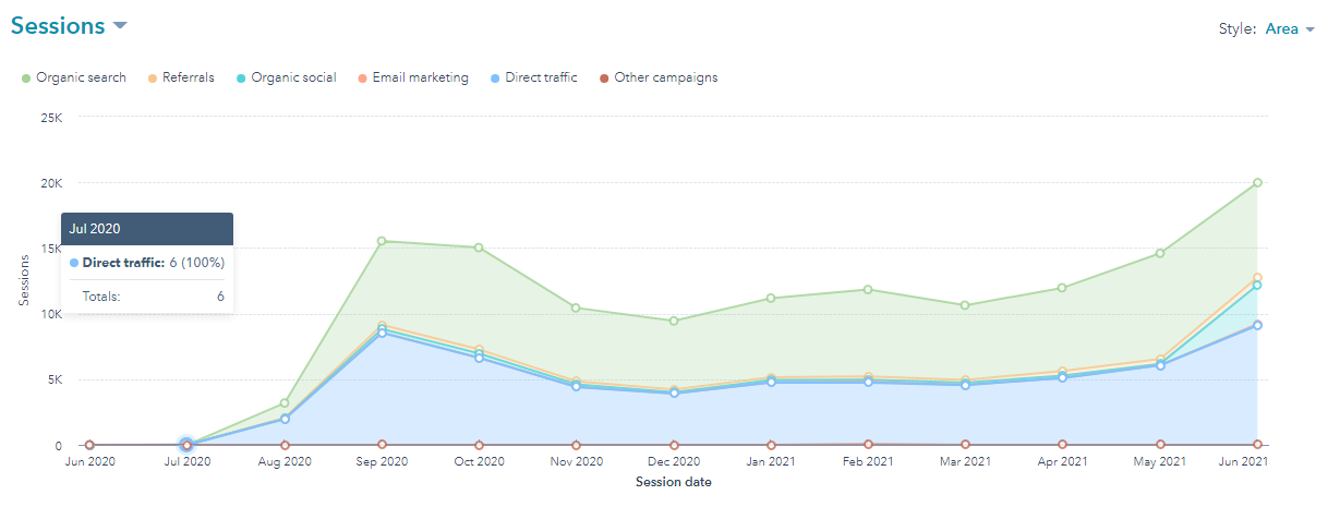 We see fantastic engagement with the new site, with average bounce rates below 50% for organic traffic sources. Direct traffic has gained 267 new contacts with a bounce rate of 58%, indicating that these users are converting quickly.