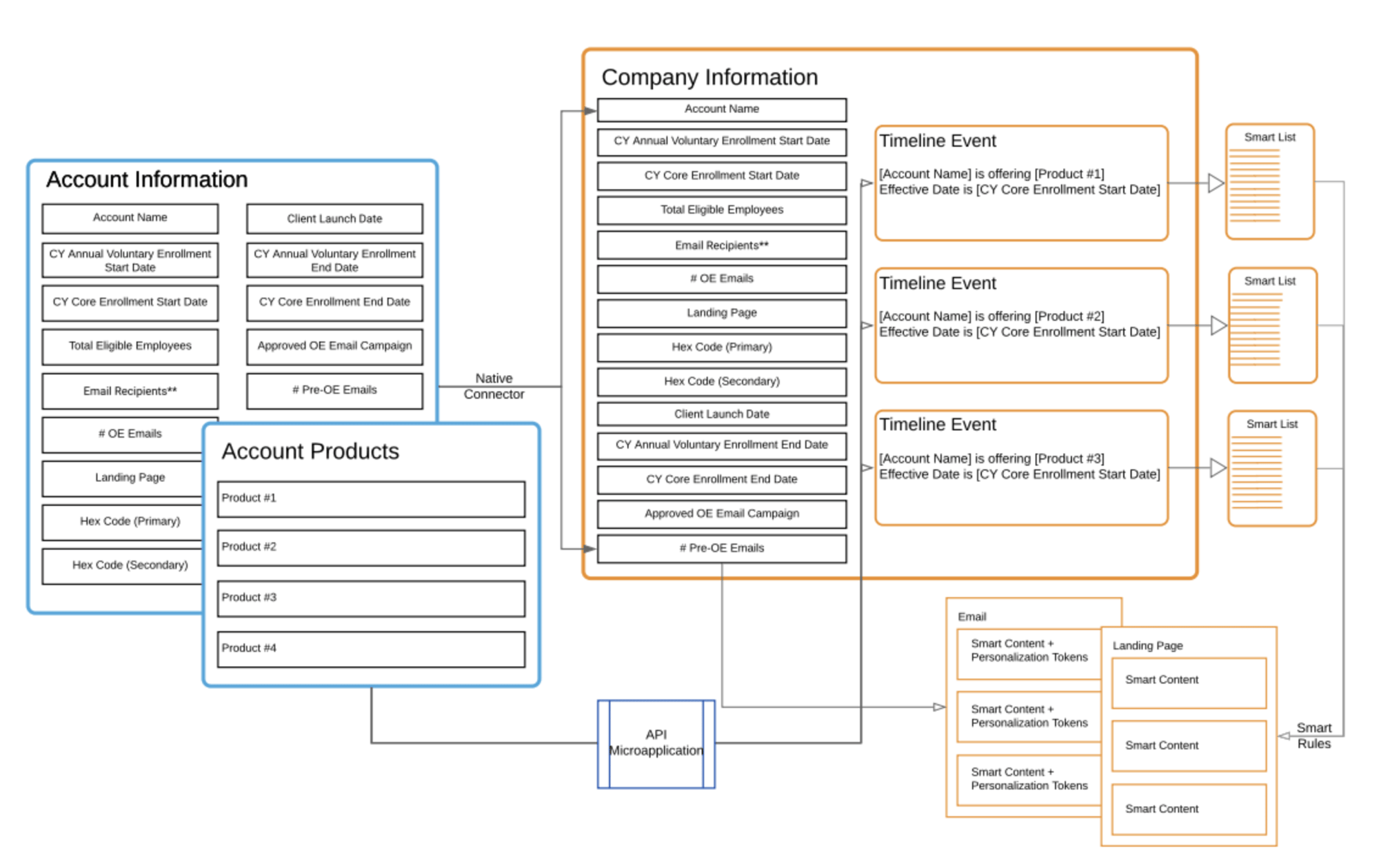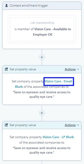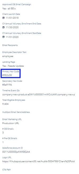 We used these product objects to tell us what benefits and providers were available to that client for the year, and then we used this information to set corresponding fields for the client that updated the standard verbiage we use to describe those products for open enrollment every year in all emails and landing pages. These fields were then able to be used as personalization tokens in emails to fill in the body content, and if the client had changes to verbiage we could make updates on the property-level on the company record instead of going into all 6 emails and landing pages and updating them individually.