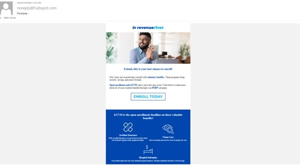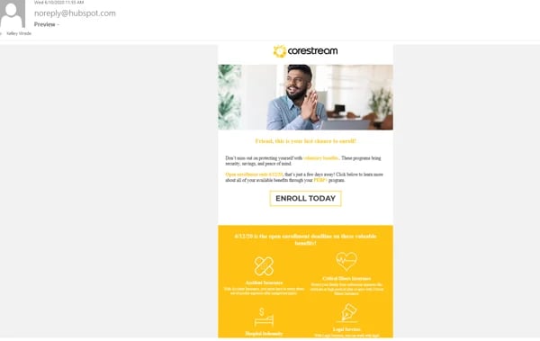 Corestream had been working with Instrumental Group (formerly Revenue River) since 2018, launching extensive email campaigns with the goal to get client employees to enroll in voluntary benefits during their annual open enrollment period. In 2020 we saw an opportunity to streamline and automate the process, greatly expanding campaign reach while simultaneously reducing effort.