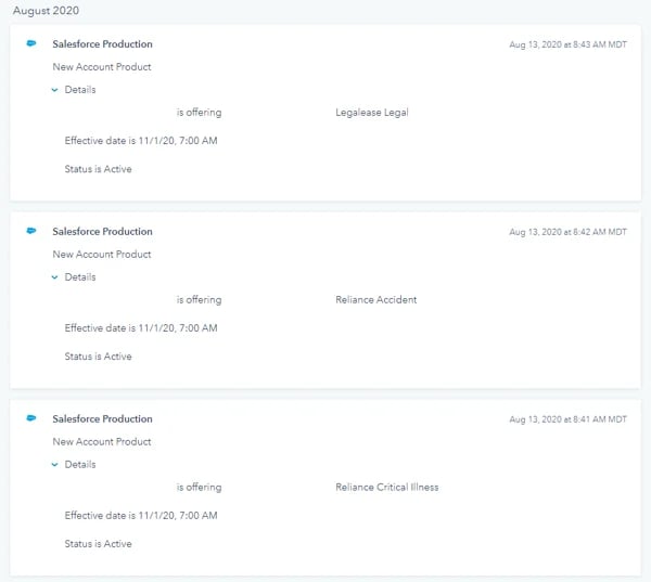 First, we configured a custom functionality in the Salesforce integration that would send product objects over to HubSpot as timeline events, which we could then reference in smart lists and workflows.