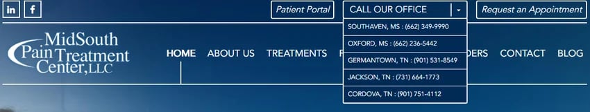 For MidSouth Pain, it's all about location. Users wanted to find the nearest clinic. So, we incorporated a multi-location call field in the header and presented each location's city, state and phone above the footer on every page.
