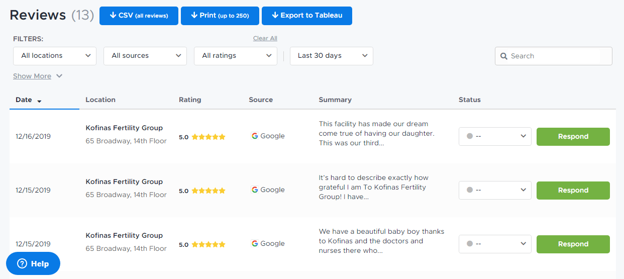 Finally, we implemented a tool called ReviewTrackers that makes it really easy for the Kofinas staff to see new reviews and respond to them for customer delight and reputation management. This is another area we were able to reduce friction in and automate so the staff didn’t have to manually monitor review platforms daily for multiple locations and it’s a way for us to still keep the entire flywheel in mind even with HIPAA restrictions.