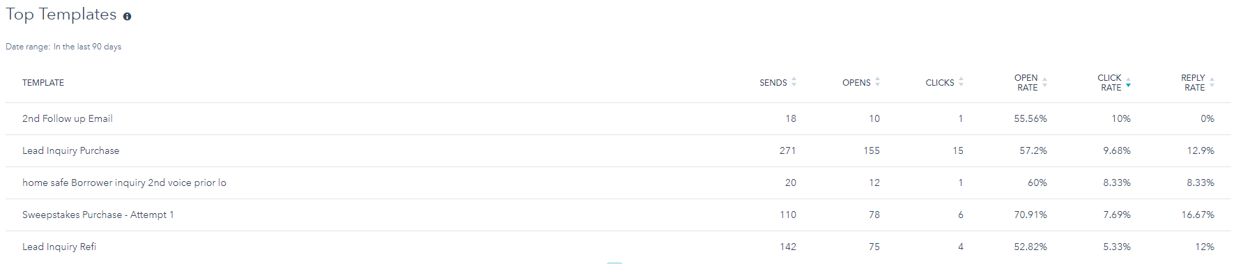 As a way to provide examples of great prospect follow-up and effective emails we created a report accessible on the Sales Dashboard that showed the Top Templates with the options to sort by opens, clicks, and/or reply rate. (click image to expand)