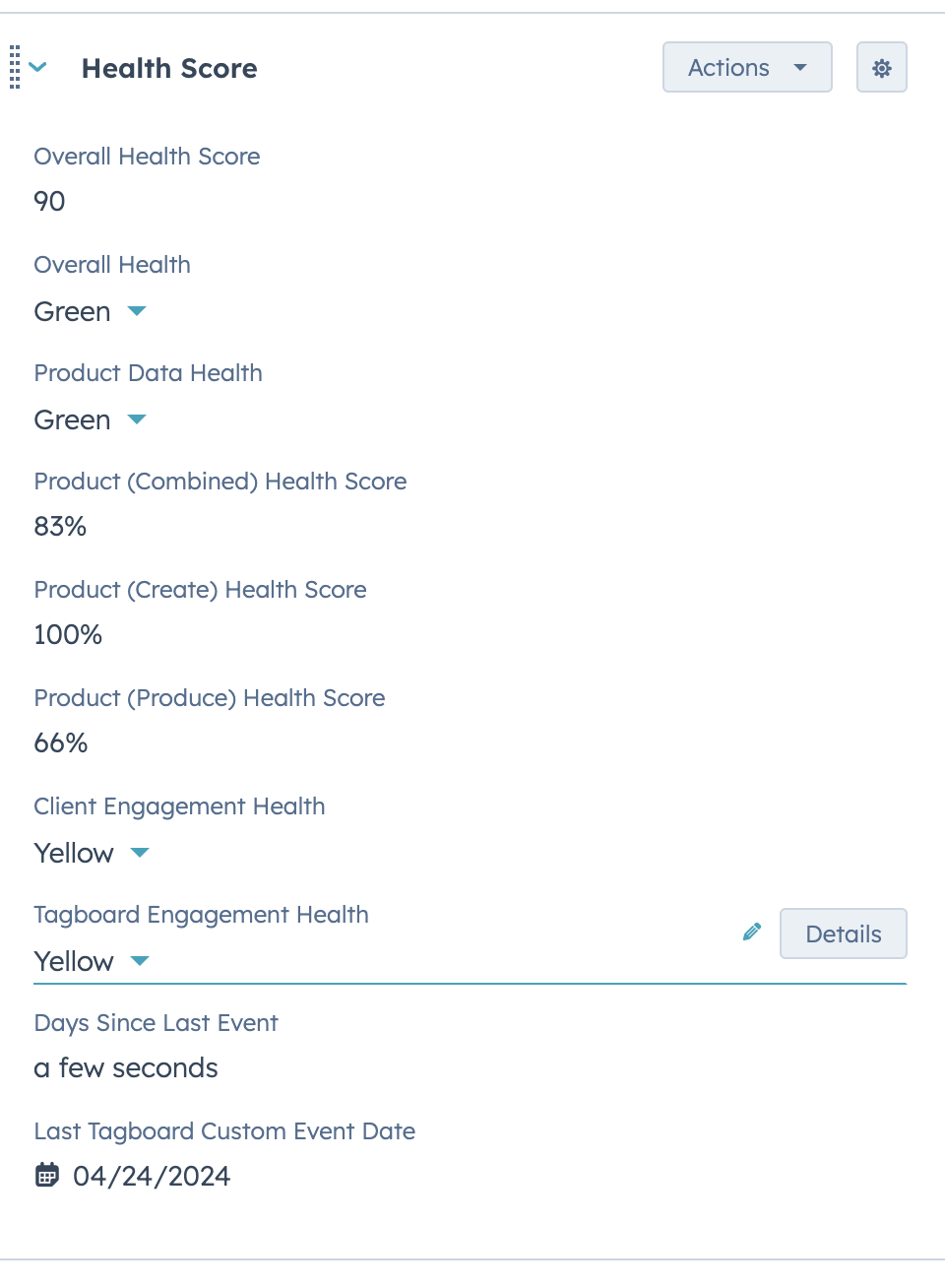 Recreating the powerful reporting the team had available in Gainsight was one of our most technical project challenges. We implemented custom code that counts the number of emails, calls, and meetings that Tagboard sent to and received from their clients and counts it by 30 days, 45 days, and 60 days. The image below shows the entirety of the data available on a variety of timeframes: