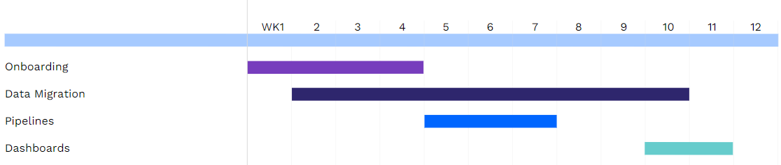 This image provides an example of how the migration components outlined may be sequenced together for a successful migration over 12 weeks. Migrations can be completed in as little as 2 weeks when needed.